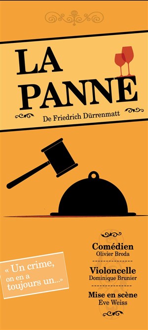 nous avions 20 ans en prépa et notre professeur d'allemand avait choisi l'étude de "Die panne "de friedrich Durrenmatt. Une révélation que nous savourions avec gourmandise en découvrant ce groupe de petits vieux jouisseurs nourris de bonne bouffe mais toujours prêts à mettre en accusation le dernier venu et prétendu coupable 40 ans plus tard, je découvre, très surpris mais ravi, qu'un même acteur accompagné d'une violoncelliste (beau duo) peut interpréter quatre personnages en simultané , pour recréer un tribunal digne de Kafka sans perdre une miette dans ce suspense Bravo l'artiste. Trop fort!!A voir et revoir,,