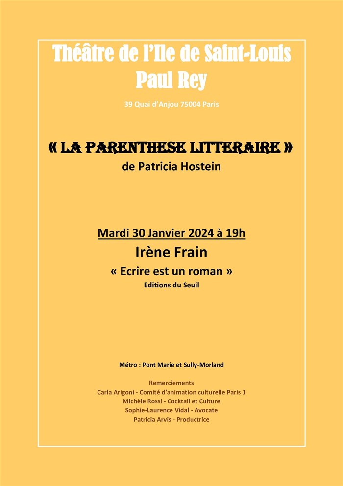 L’événement La Parenthèse Littéraire de Patricia Hostein : Irène Frain de type Lecture / Rencontre / Conférence / Masterclass, organisé ici :