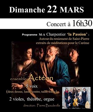 Par l'ensemble Actéon : 5 voix (deux dessus, haute-contre, taille, basse), 2 violes, théorbe, orgue.
