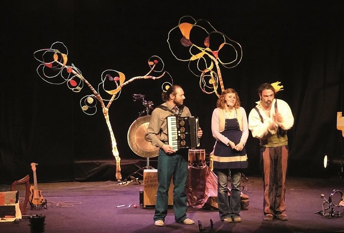 " ...Ces péripéties sont autant d'occasions de créations de chansons, façon opéra-rock. Sur scène, les trois comédiens-musiciens dans leurs rôles de narratrice, prince et princesses deviennent tour à tour cheval, marraine, marâtre... L'histoire se vit, se raconte et se chante en même temps... "