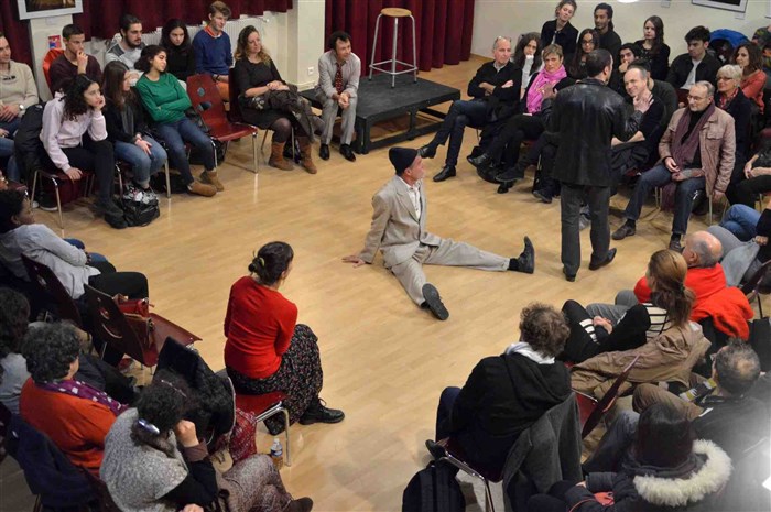 Installé autour d'une aire centrale de jeu, le public est invité à assister à une joute oratoire autour du thème "Qu'est-ce que la justice ?".