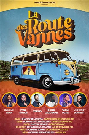 Festival d'humour (une scène en extérieur au pied du château viticol), avec Aymeric Lompret, Bun Hay Mean, Donel Jack'Sman, Paul Taylor, Tania Dutel et Vérino