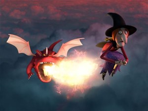 Une sympathique sorcière, son chat et son chaudron s'envolent sur un balai. Quel bonheur de voler ! Mais le vent se met à souffler très fort, et un dragon affamé vient de se réveiller...