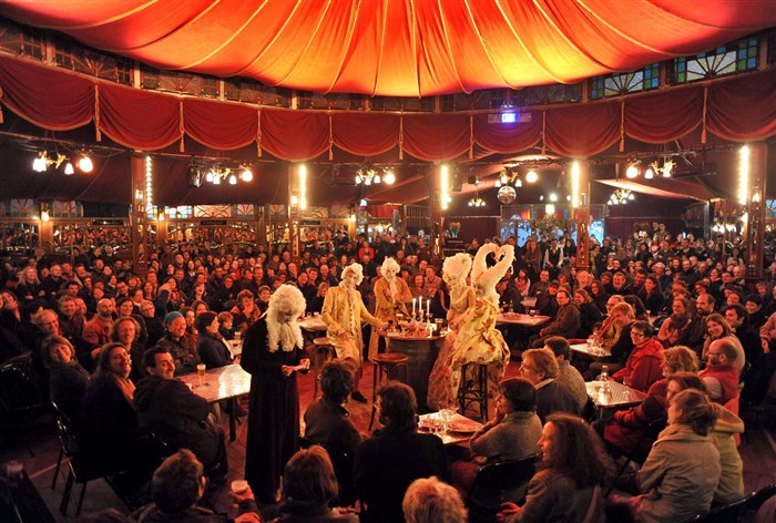 En costumes d'époque, perruques et belles toilettes, des mythomanes sont attablés au centre de la taverne pour quelques "joutes verbieuses et improvisades"