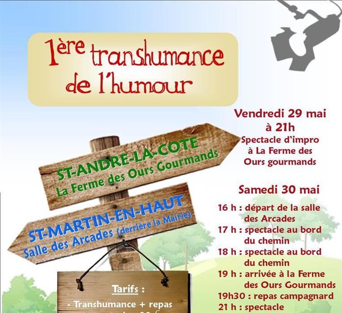 Le départ de la Transhumance se fera à 16h le 30 mai depuis la Salle des Arcades à Saint-Martin-en-Haut, pour rejoindre St-André-la-Côte, où pendant tout l'été sera proposé des spectacles d'humour.