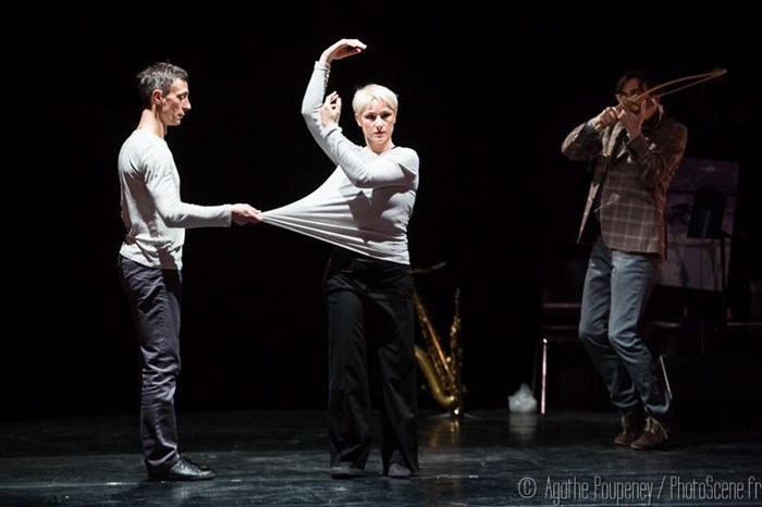 Dans le cadre d'une conférence poétique des plus documentées, les deux danseurs et le musicien explorent toute la gamme des frottements possibles.