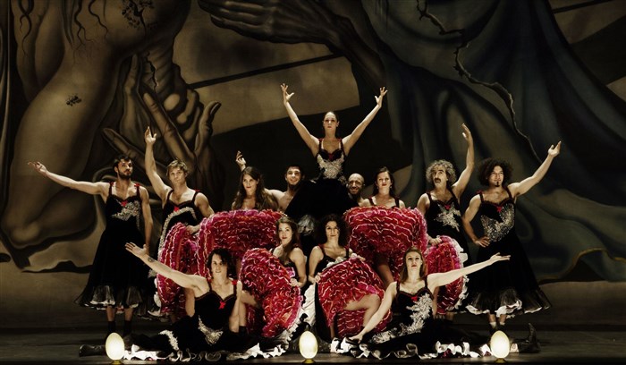 Sur scène 13 artistes multidisciplinaires rassemblés autour d'une gigantesque toile originale, peinte par Salvador Dalí dans les années 40 à New York pour son ballet " Tristan Fou ".