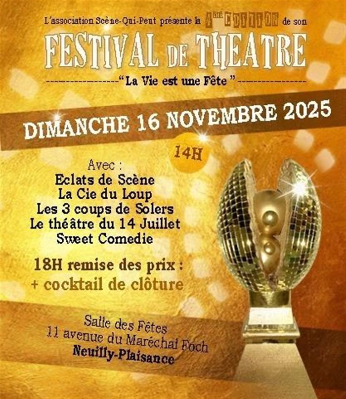 L'Association Scène qui Peut est fière de vous presenter la 4ème édition de son festival de théâtre, avec pour thème cette année "La vie est une fête".