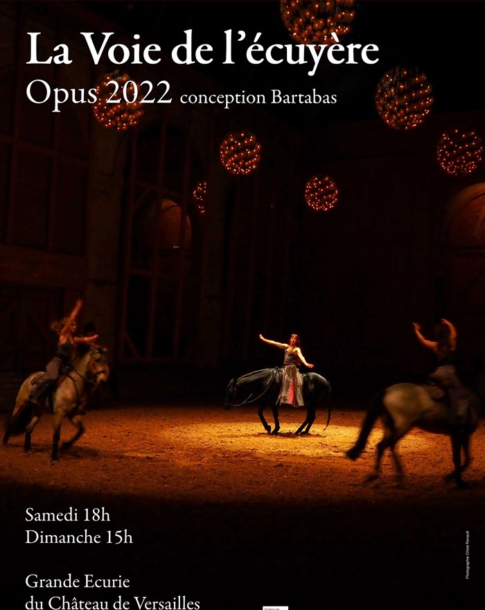Tous les samedis et dimanches et certains mercredis en période de vacances scolaires à la grande Ecurie du Château de Versailles, l'Académie équestre présente La Voie de l'écuyère, chorégraphié par Bartabas.