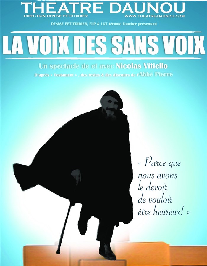Une très bonne surprise ! Plus que jamais d'actualité, c'est un spectacle atypique, où se mélange interviews et discours publics et anecdotes de la vie de l'Abbé Pierre. la grande réussite de ce spectacle tient aux qualités de l'acteur de et la mise en scène, totalement au service de la parole de l'Abbé. Avec sincérité, humilité et humour, générosité, Nicolas Vitiello, dans un registre inhabituelle, se révèle un acteur intense. Le lien d'amour et d'humaniste qui unit l'acteur à son personnage transpire pendant toute la pièce. Un spectacle qui émeut, qui bouleverse, qui rend heureux.