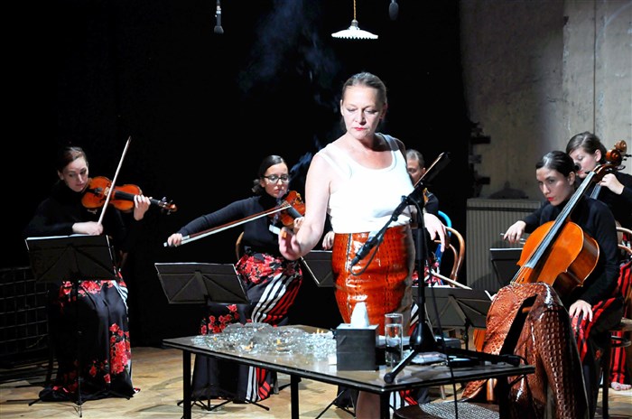 La présence de la comédienne résonne avec la musique de l'ensemble à cordes.