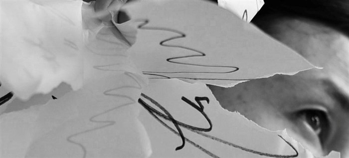 Elle est assise. Une table au centre du plateau, un carnet dont les feuilles s'arrachent : c'est son voilier.