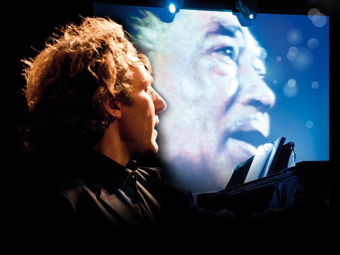 Par la magie du video-art, il témoigne, présente des inédits, dirige l'orchestre, communique ses valeurs ...