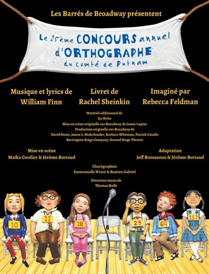 Les Barrés de Broadway sont fiers de vous présenter leur nouveau spectacle venu tout droit de Broadway où il s'est joué pendant un peu plus de deux ans, Le 25ème Concours Annuel d'Orthographe du Comté de Putnam (The 25th Annual Putnam County Spelling Bee).