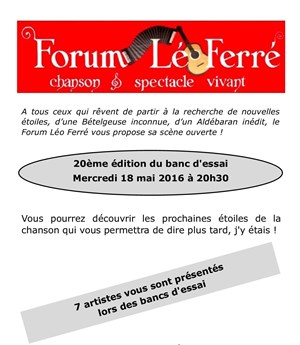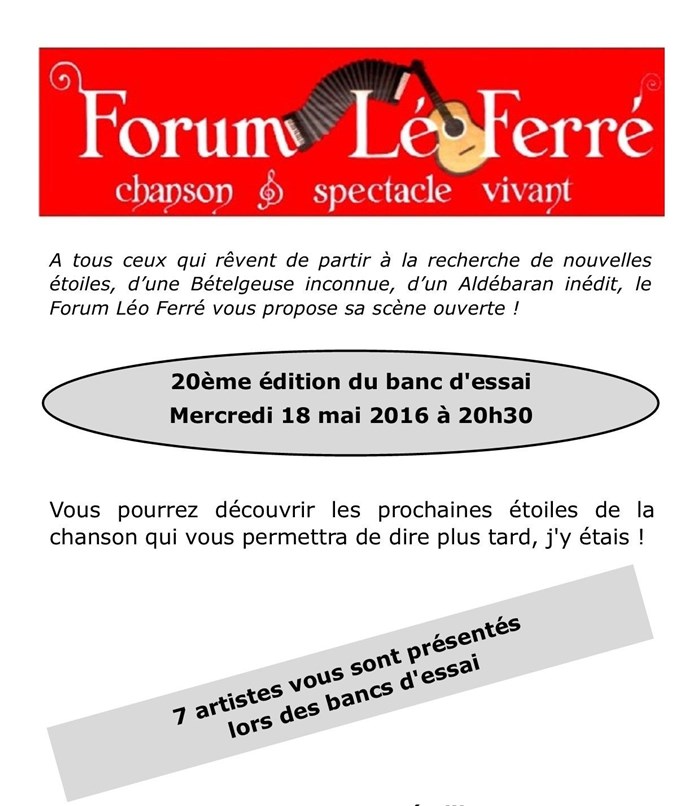 Tu veux savoir ce qu’ont pensé les spectateurs et la presse de cet événement : Le banc d'essai 20ème édition - Forum Léo Ferré ? Découvre leurs avis éclairés et prépare-toi à vivre un moment d’exception à ton tour en réservant tes places !