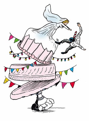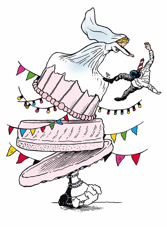 Fête d'après la noce, le banquet rassemble les familles et les joies, les rancoeurs et les ratages. Chacun y va de son numéro comique, chansons et danses, tragédie du spectacle des humanités réunies. Le père fait son discours et la mère son intéressante. On boit, trop. Une dame grosse cherche son chien, dont la robe de la mariée se souviendra. On pleure, on rit, on se tache beaucoup. On saigne et on vomit, c'est la catastrophe joyeuse d'une communauté en fête qui crie, vocifère, pérore. Personne ne se parle. On s'agite et se pavane, glisse, tombe et se relève. C'est toute une vie en une soirée sans paroles.