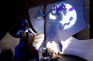 Dans ce navire cocon de soie blanche, les voiles s'illuminent d'ombres colorées, les mots deviennent salés, les images se doublent d'odeurs, les vagues semblent caresses, et la musique boisée du duo accordéon-violoncelle glisse sur les flots comme une berceuse océanique.