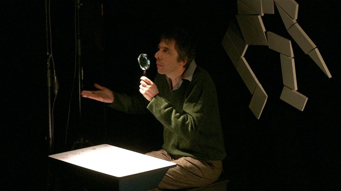 En projetant sur un grand écran les fragments d'un livre, Patrick Corillon, raconte l'histoire d'un homme confronté aux images de son enfance