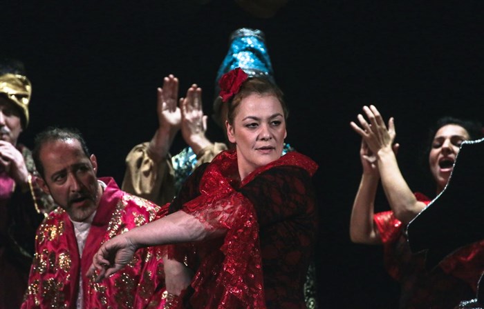 Dans cette mise en scène définie comme " flamenco-taurine " les costumes sont éclatants – des chevaux de théâtre surgissent, des épées sortent de leur fourreau et une musique aux tonalités andalouses, donne régulièrement un rythme trépidant.