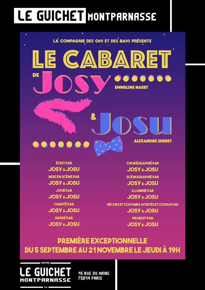 J'ai souvenir que le film "Cabaret Paradis" avec Shirley & Dino n'avait pas trouvé son public auprès des familles parisiennes. Qu'à cela ne tienne, le Cabaret de Josy & Josu est là maintenant pour vous en mettre plein la vue. Duo à la fois coloré et totalement saugrenu qui a pour objectif de nous amuser à leurs manières et de nous satisfaire avec leurs accoutrements. Cette pitrerie romanesque (rehaussée par Josy à la sauce Dunkerquoise et agrémentée par Josu à la mode de Brodway) s'essaye tant qu'ils le peuvent, à l'exercice délicat de La Première. Et c'est dans cette ambiance particulière que les tableaux s'enchainent avec leurs lots de frasques et de fantaisies apportant à cette charmante comédie son timbre si fleuri. Je me souviens quand Julie Depardieu s'est éprise de Philipe Katerine. L'actrice et le chanteur, aux destinées fragiles. Leur rencontre a donné naissance à un couple atypique. Il est fort à parier que l'union de Josy et Josu soit l'éveil d'un nouveau rayonnement artistique tout aussi extravagant. Venez les soutenir dans leurs délires et délivrez-leur le plein d'applaudissements. Vous serez conquis par leur bienveillance et surtout témoin de leurs concupiscences. Bravo