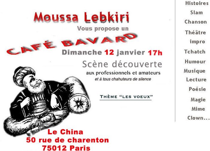 Moussa Lebkiri lance son 1er Café Bavard en janvier 2012 dans un lieu symbolique où Édith Piaf et Maurice Chevalier ont poussé leurs chansonnettes, le "Café de Paris " Paris 11ème.