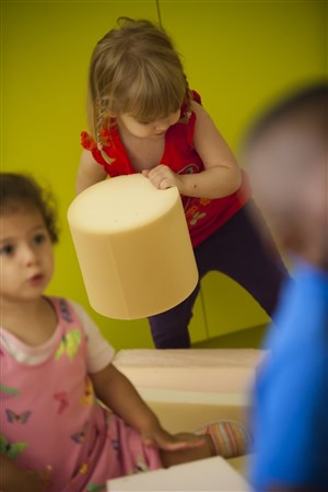 2/ Atelier animé par les deux artistes : de 17h à 18h La fin de la performance invite le jeune public à voir, approcher, toucher, en un mot participer. La mousse par son moelleux et ses couleurs douces favorise la construction collective d'architectures simples et éphémères. Comme dans tout processus d'apprentissage, 3 phases ponctuent la démarche du groupe : reconnaissance, appréhension et préhension de la matière.