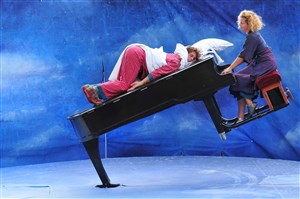Malicieux, facétieux, Dirk l'acrobate et jongleur, a tendance à s'amuser de tout, tandis qu'imperturbable, Fien, la musicienne, le suit dans tous ses délires et l'accompagne au piano quoiqu'il arrive, même lorsque l'instrument se met à tourner et à se dresser. Tout est magique dans cette pièce où la fantaisie et l'humour plient le monde aux règles de la poésie.
