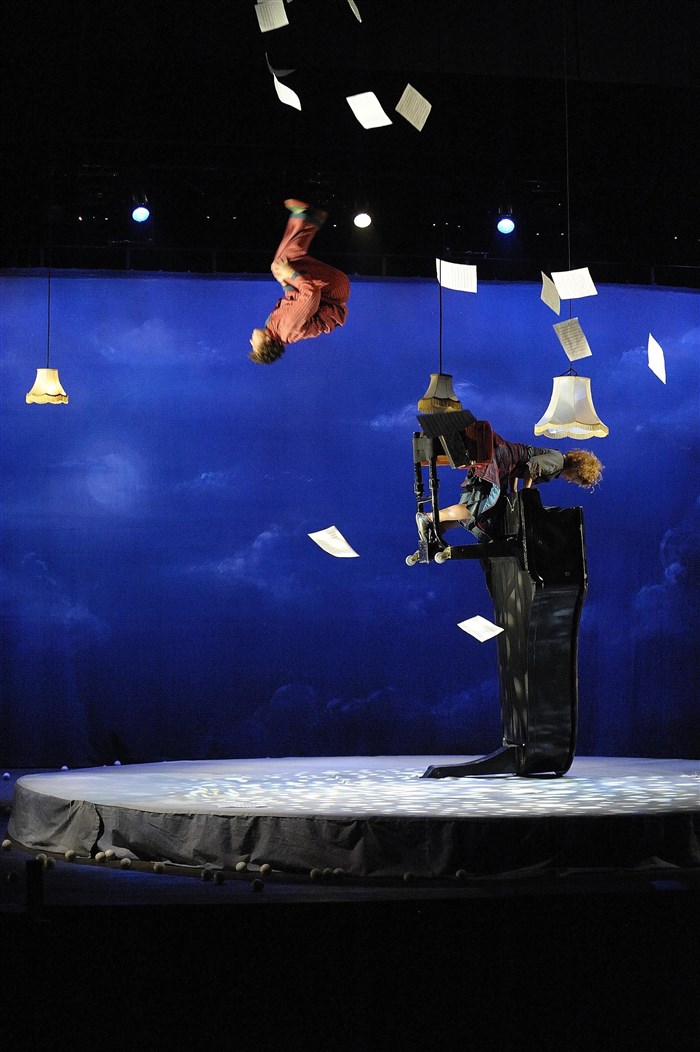 Une musicienne et un acrobate décalé, un piano comme partenaire, offrent un spectacle muet, délicat et drôle, comme une boite à musique qui fait tourner les têtes.