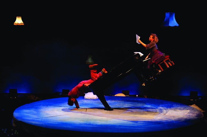 Cirque de l'instant présent : un balai pour trapèze, un piano-acrobate, d'innombrables moutons... Un corps-chapiteau, pensée tissée d'étoiles,