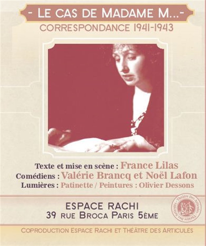 Madame M... femme de théâtre pendant la 2ème guerre mondiale veut monter "Six personnages en quête d'auteur" pièce de Luigi Pirandello, créée à Paris en 1923 par les Pitoëff. Elle écrit le contenu de ses rêves à un ami juif, psychanalyste, réfugié en zone libre. Cet échange épistolaire lui permet de surmonter les épreuves et de donner en dépit de tout, un sens à sa vie. Les peintures projetées d'Olivier Dessons font miroir aux rêves de Madame M ...