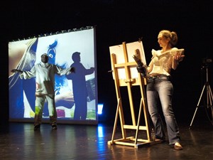 Sur la scène des aquarelles immenses bougent, la dame peint et sous ses mains un jeune homme danse la caresse pour devenir léger ! Il danse Hip Hop et c'est comme ça qu'il devient oiseau, mais le chat-gris, le gris-chat grogne...