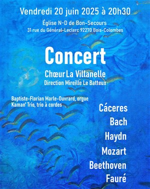 Le Choeur La Villanelle, dirigé par Mireille Le Batteux, accompagné à l'orgue par Baptiste-Florian Marle-Ouvrad, organiste titulaire à St Eustache (Paris) et par le Kaman'Trio, trio à cordes interprètera :