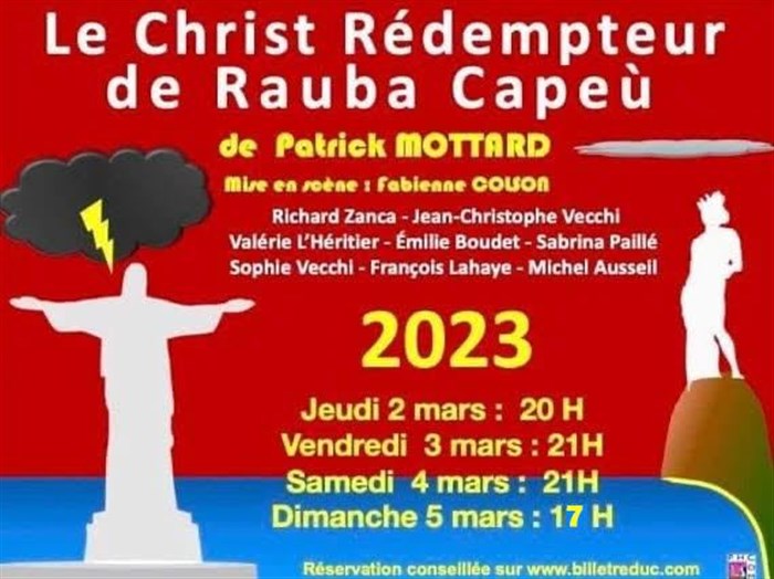 Excellente pièce de Patrick Mottard ! Le Christ Rédempteur est la grande statue du Christ qui domine Rio de Janeiro, au Brésil... Que se passerait-il si, en 2060, le nouveau maire de Nice, aux idées extravagantes, installait cette oeuvre de 38 mètres de haut à Rauba Capeù, dans le cadre d'un échange de monuments ? Au final, une pièce loufoque et drôle, portée par des personnages hauts en couleur, bourrée de clins d'oeil sur la vie politique niçoise. Mention spéciale à Didier Veschi, en premier adjoint plus vrai que nature, et Virginia Ricordeau, en journaliste télé enthousiaste.