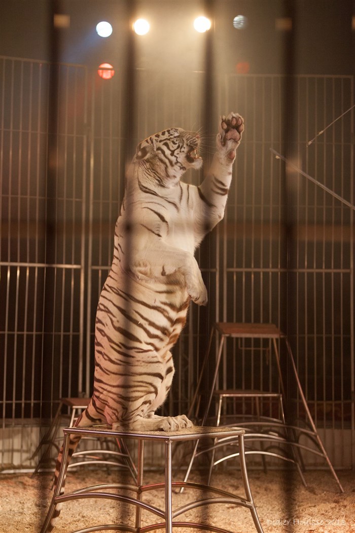 Yann Dumas et son groupe de mixte de fauves : lionnes, tigreses et tigre blanc