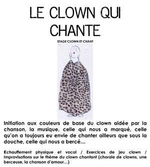 Echauffement physique et vocal / Exercices de jeu clown / Improvisations sur le thème du clown chantant (chorale de clowns, une berceuse, la chanson d'amour... Les débutants sont les bienvenus !
