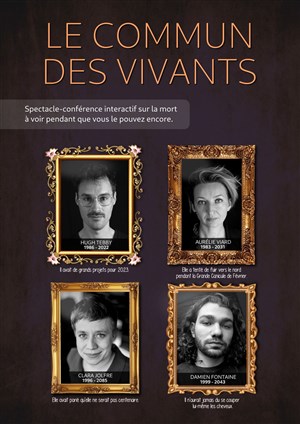 Le Commun Des Vivants est une conférence à but informatif sur la mort et la fin de vie. Mais c'est aussi un spectacle où les scènes jouées seront inspirées par le public.