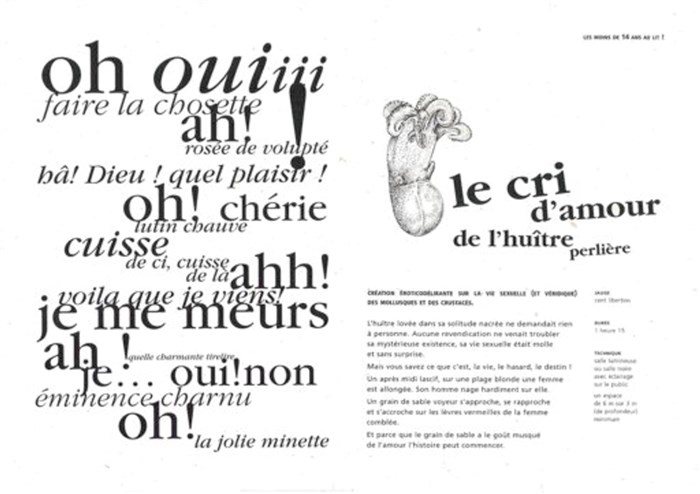 Création érotico-délirante sur la vie sexuelle et véridique des mollusques et des crustacés.