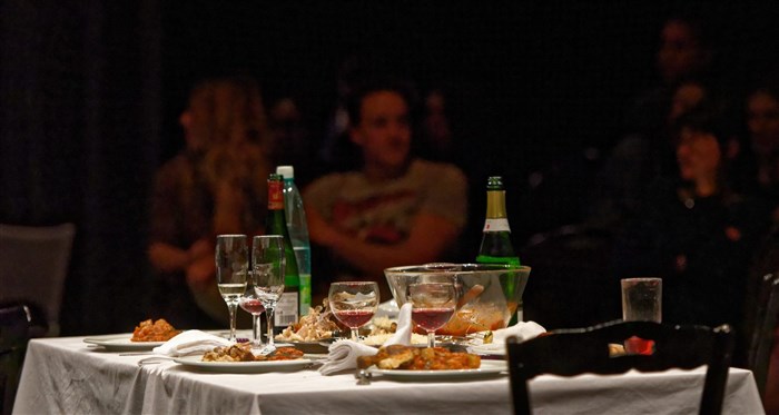 Dans ce diner unique en son genre, auquel sont conviés cinq comédiens et un DJ, personne ne sait à quelle sauce il va être mangé.