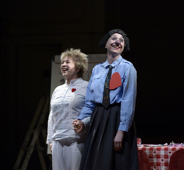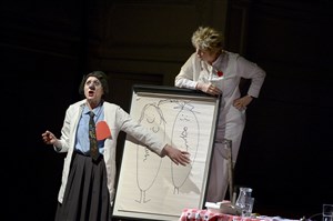 Installées sur l'avant-scène, derrière une table et des micros, les deux femmes jouent une conférence. Chacune dans son registre, toutes deux formées un temps donné à l'École Internationale de Théâtre de Jacques Lecocq, elles portent une parole parfaitement juste entre sérieux et burlesque.