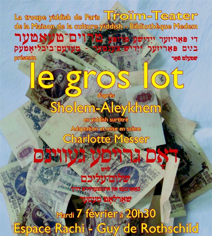 La Compagnie " Troïm Teater " (théâtre du songe), le spectacle qui est une adaptation de l'oeuvre homonyme de Sholem Aleykhem, est la troisième pièce du répertoire yiddish que le Troïm-Teater présente au public.