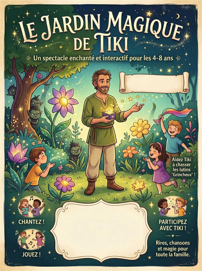 Le jardin magique de Tiki est un spectacle interactif où magie et humour se mêlent pour offrir aux enfants un moment unique, tout en douceur et en rires.