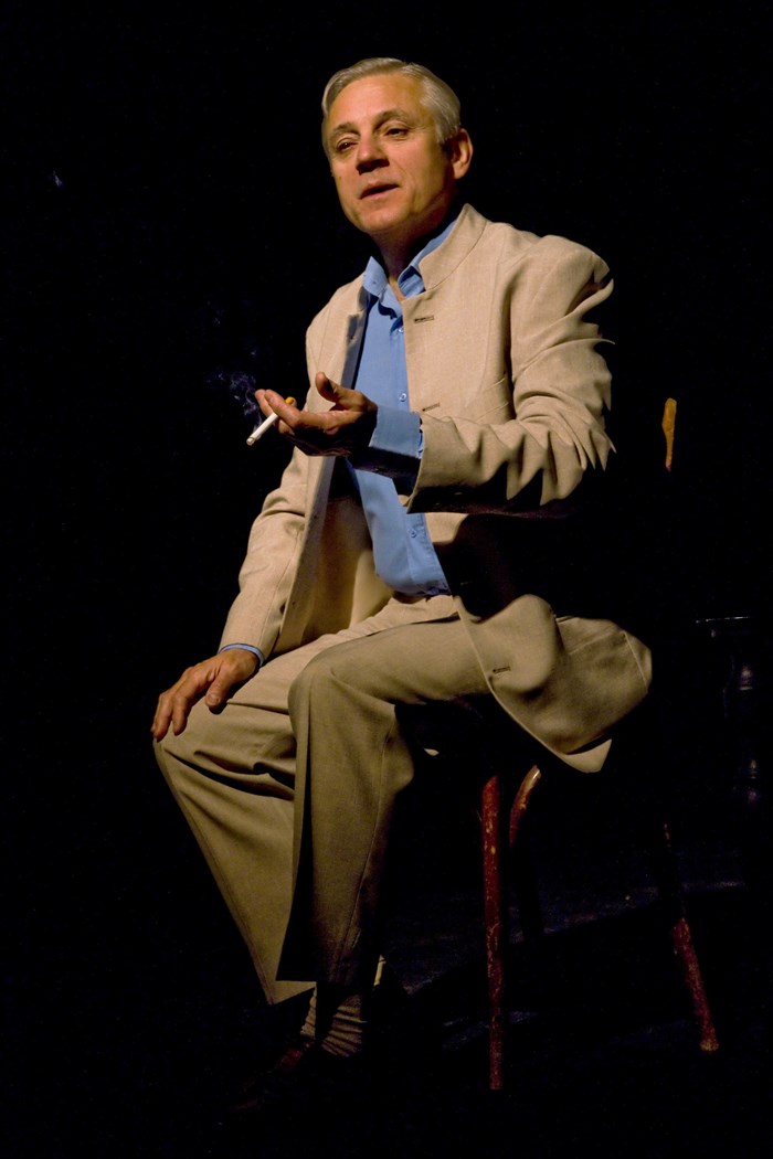 En costume de lin et écharpe de soie blanche, canne et panama, accessoires distinctifs de l'homme élégant, André Salzet incarne tous les protagonistes, en passant de l'un à l'autre.