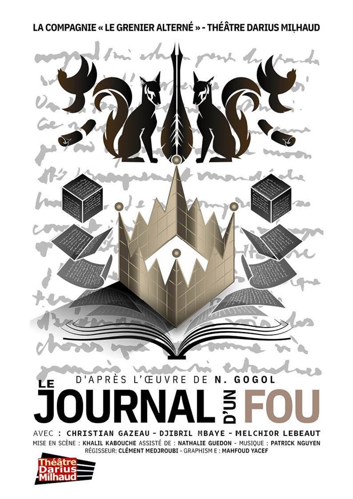 Pour la restitution théâtrale de cette oeuvre, Khalil Kabouche a choisi de mettre en scène 3 comédiens pour un seul personnage : trois voix, trois corps, comme d'un seul esprit, se partagent le journal et rejouent sa partition. Trois incarnations pour une seule et même folie, miroir brisé aux mille facettes...