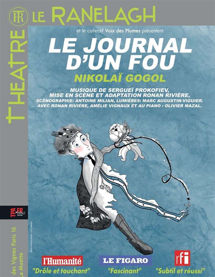 Déjà plus de 100 représentations pour cette adaptation de la plus drôle et la plus touchante des Nouvelles de Pétersbourg de Gogol portée par 3 interprètes, avec des morceaux de Prokofiev au piano en direct.