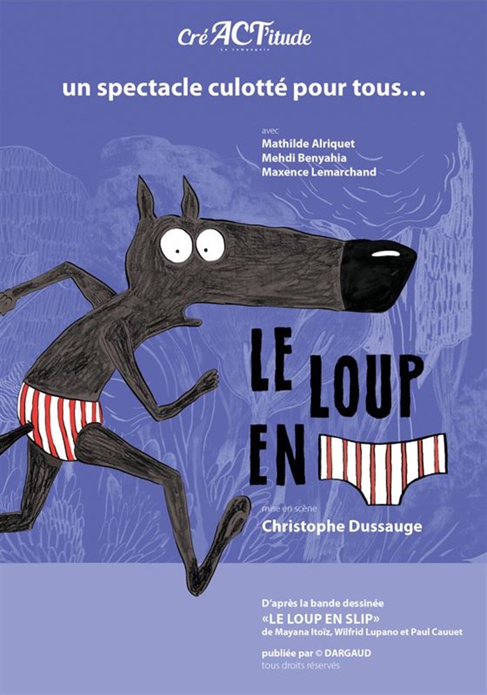 "Le loup en slip", c'est l'histoire originale d'un loup "pas comme les autres", mais également une fable, qui questionne l'époque actuelle, en la mettant sur la scène : comment faire preuve de discernement, face à la rumeur ? Que se passe t'il lorsque la terreur l'emporte sur l'objectivité ? Comment vivre sans la peur, quand la peur est devenue l'unique moteur ?