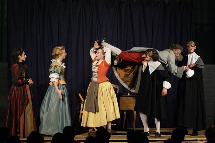 Fidèle à Molière, la farce,le théâtre de tréteaux et la comédie italienne, la mise en scène de Carlo Boso puise très largement dans la Commedia Dell'Arte. Ici, la vivacité des échanges et l'importance du langage corporel se mêlent à une intrigue complexe ou les habiles stratagème, les intrigues des amoureux contrariés, les effets comiques donnent au texte une dimension plus loufoque.