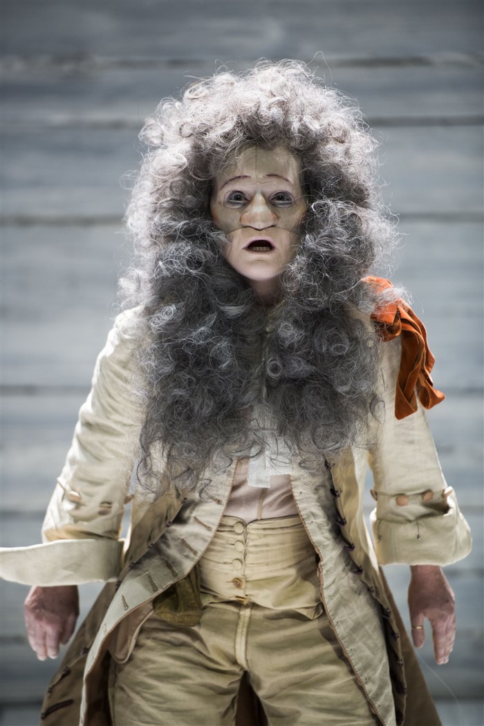 Dans un décor constitué de lattes en bois blanchi, du sol aux murs, évoquant les tréteaux du théâtre de foire ou bien une boîte oppressive dans laquelle les névroses du mari/Sganarelle sont enfermées, les comédiens affublés de masques embrassent la complexité de notre monde.