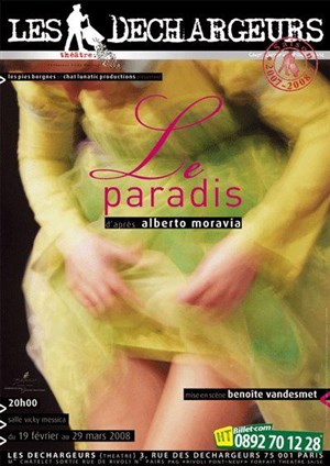 Quatre tableaux, quatre climats. Libre adaptation de nouvelles d'Alberto Moravia, "Le Paradis" est une pièce qui met en scène dans un univers électrique, fantastique, des personnages hantés par leurs fantasmes et leur folie. Ambiance cabaret, échappatoire jubilatoire, offrant fantaisie et numéros variés... Cadre des apparitions de cinq femmes vraiment fatales.
