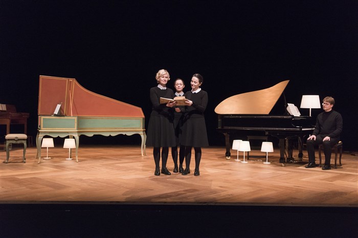 Sur scène, Agathe Mélinand compose avec deux comédiennes, Christine Brücher et Fabienne Rocaboy, et deux instrumentistes, Béatrice Martin et Charles Lavaud. Il y a un piano, un clavecin et un clavicorde, comme ceux que Bach aimait tant, des lampes un peu partout. Comme à la maison. Il n'y a pas de costumes d'époque. Et comme, chez les Bach, on vivait et on jouait avec et pour les enfants, c'est aussi un spectacle pour les enfants.