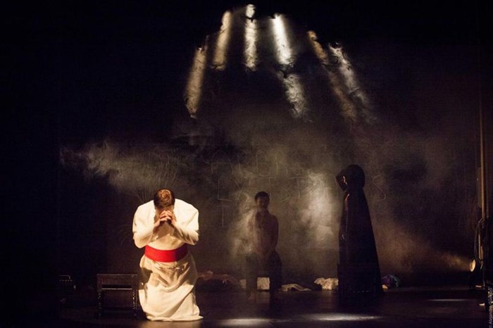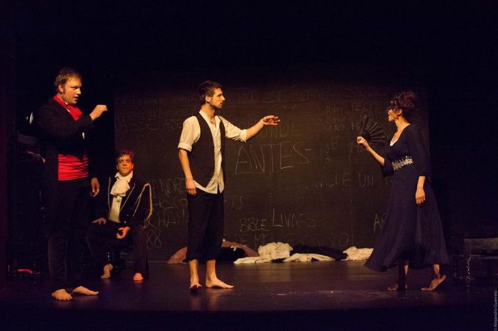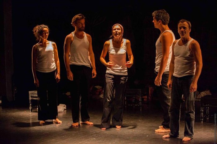 On voyage uniquement par le biais de cinq acteurs, de cinq tabourets, d'un plateau nu, de deux portants chargés de costumes et du pouvoir illimité de notre imaginaire.